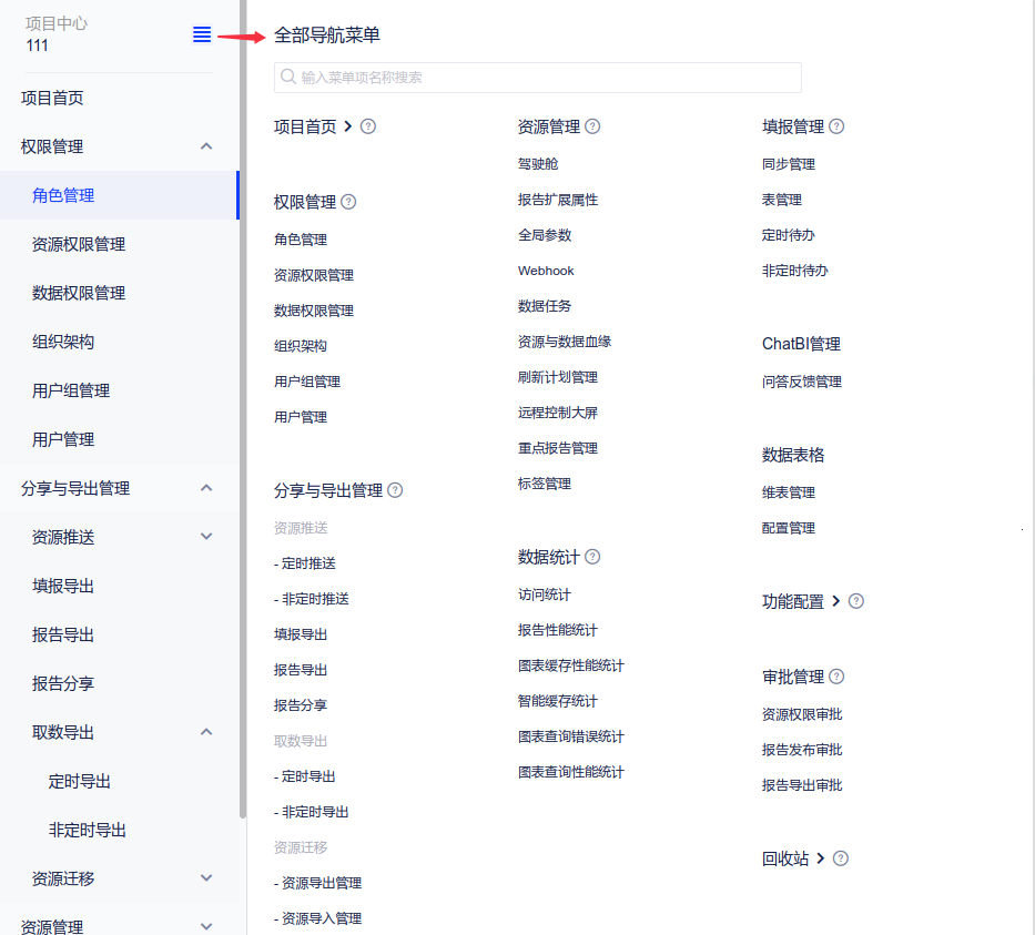在本产品中,所有资源、用户都是以项目组织并隔离的。不同项目之间的数据连接、数据模型、报告等资源都是相互隔离的,用户只有在加入该项目并被分配角色权限后,才能访问资源。 在项目中心,您可以进行项目层面的相关设置。 权限管理资源迁移刷新计划Webhook管理资源与数据血缘数据任务数据统计功能配置回收站