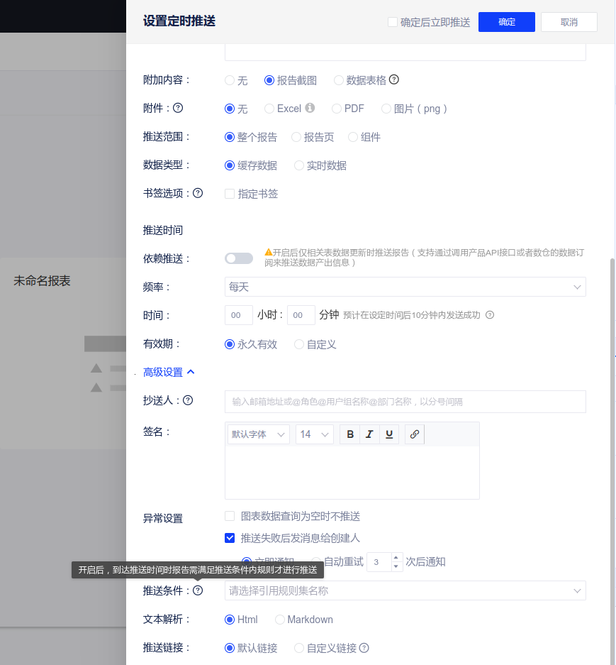 (5)报告定时推送支持推送条件判断功能,支持选择一个智能决策中的规则集,如不满足规则,则本次定时推送将不推送。