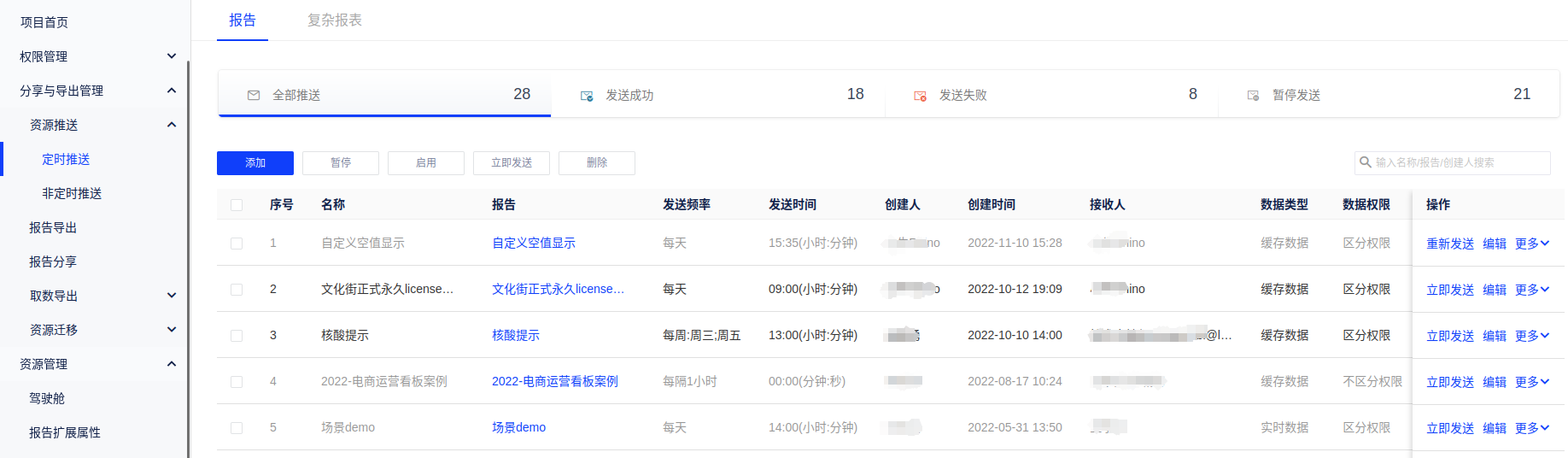 您可以通过设置定时推送,定时查收系统推送的报告信息,密切跟进数据近况。同时产品提供的推送管理功能,可以协助您管理推送记录,并支持对有管理权限的报告下的推送进行修改。
