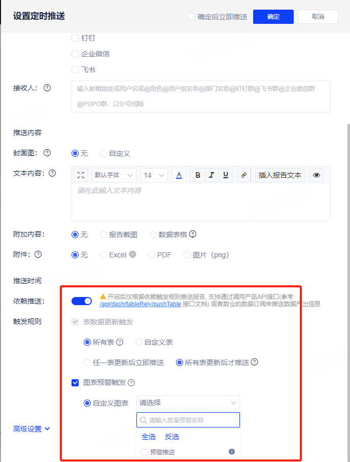表数据更新触发:可选择触发的表范围(所有表或自定义表范围),基于选择的表范围可再选择任一表更新后立即推送或所有表更新后才推送,所有表不包括Excel和csv类型数据源。