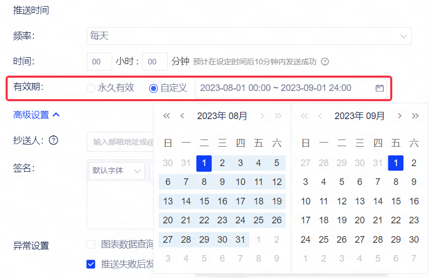 您可以在报告定时推送设置中设置推送有效期,默认为永久有效,选择自定义后,支持配置【开始日】与【到期日】,选框内默认选择为当天~一个月。