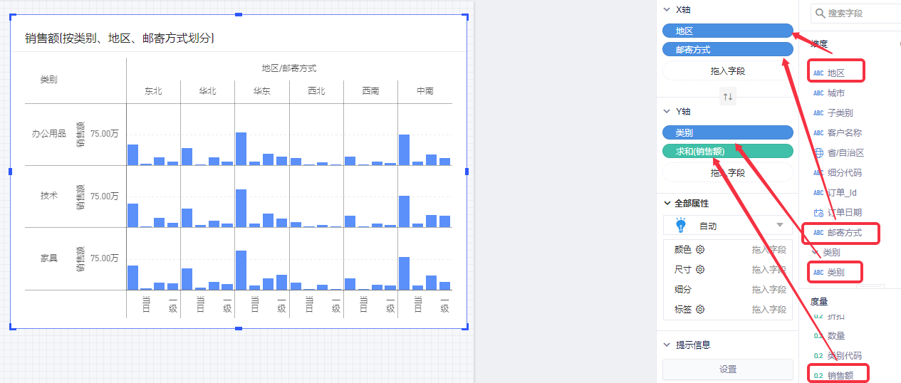以默认数据模型为例,查看各地区、各产品类别、不同邮寄方式的销售额情况,将涉及到4个字段: 维度“地区”、“类别”、“邮寄方式”,度量“销售额”。