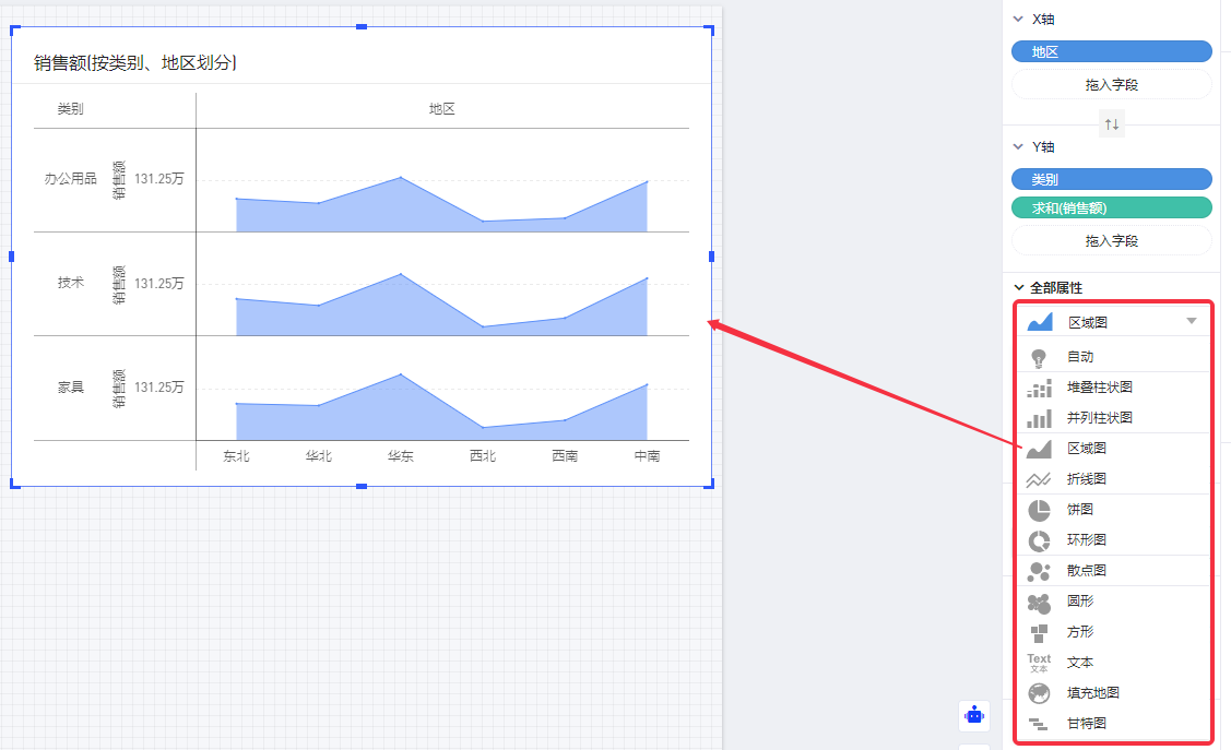 (3)可以在属性面板中图表类型切换需要的图表。