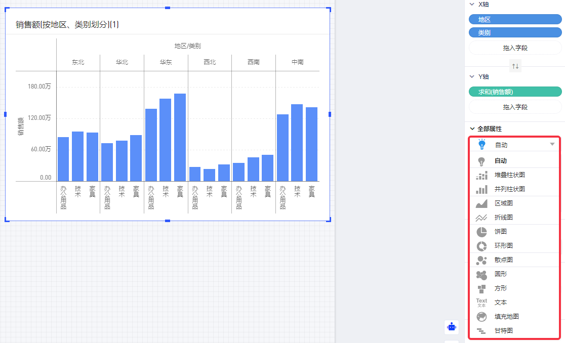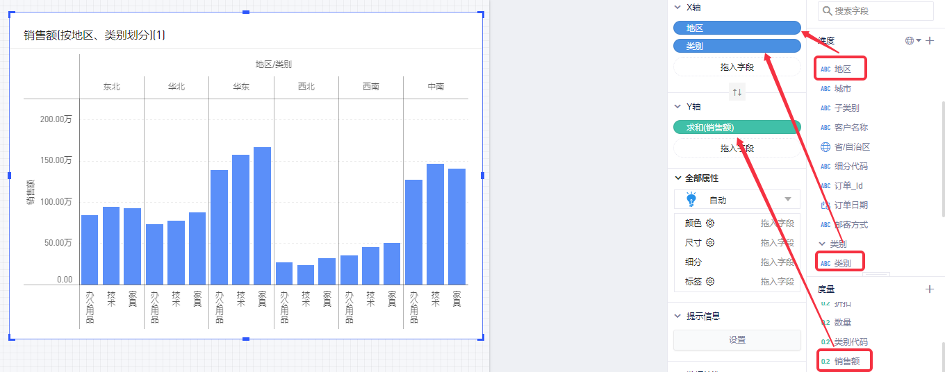 以默认数据模型为例,查看各地区、各产品类别的销售额情况,将涉及到3个字段: 维度“地区”、“产品类别”,度量“销售额”。