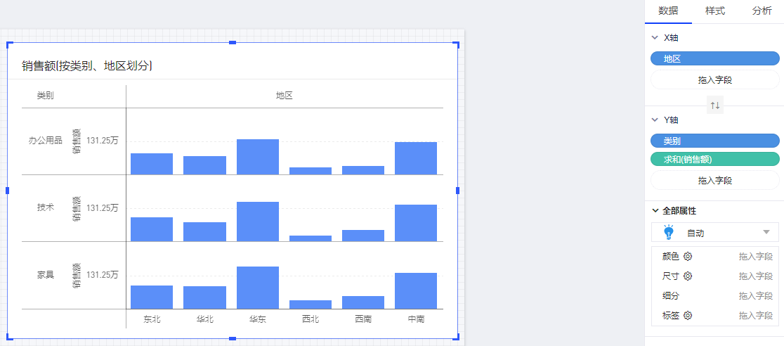 (2)在图表的数据面板的操作:在X轴放入维度“地区”和“类别”,在Y轴放入度量“销售额”,即可自动生成透视图。