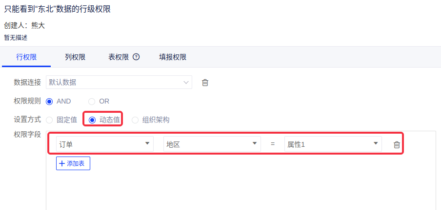 (2)创建一个“数据行级权限”,选择要设置权限的数据连接,设置方式选择“动态值”,选择要设置权限的表跟字段,选择要匹配的用户属性,在本例中,即将“地区”字段匹配“地区”属性;