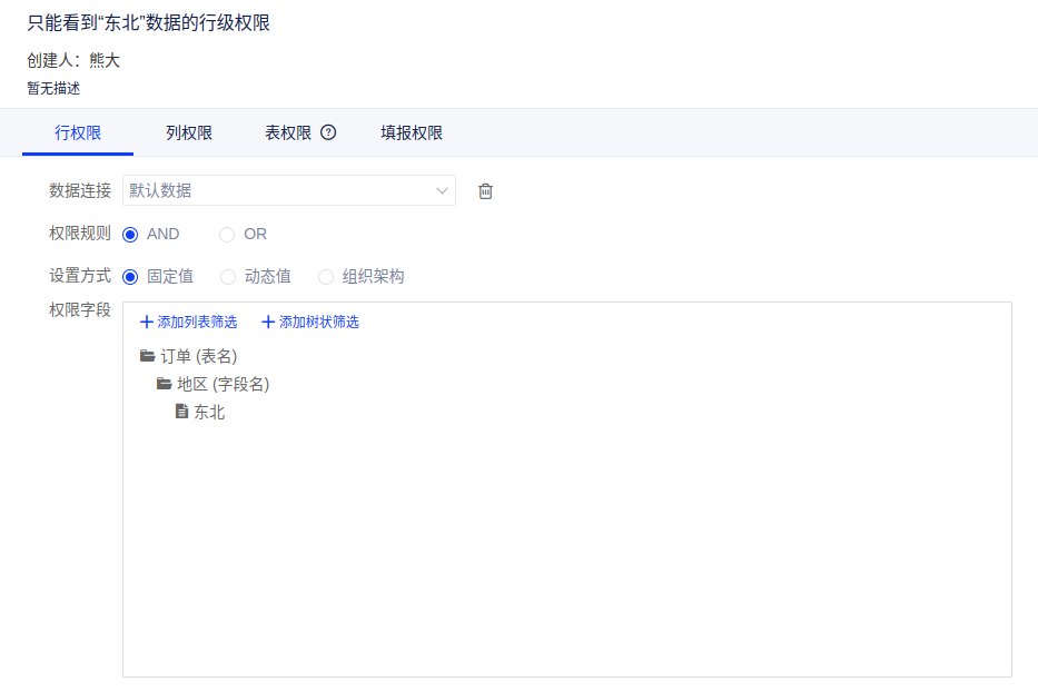 创建4个“数据行级权限”,每个“数据行级权限”只能访问一个大区的数据,然后给不同大区的销售人员分配对应的“数据行级权限”。例如东北大区的销售人员只能看到“东北”地区的数据,我们可以建立一个“数据行级权限”,然后设置数据访问权限,只允许该角色成员访问“东北”地区的数据,然后将该“数据行级权限”赋予东北大区的销售人员即可。
