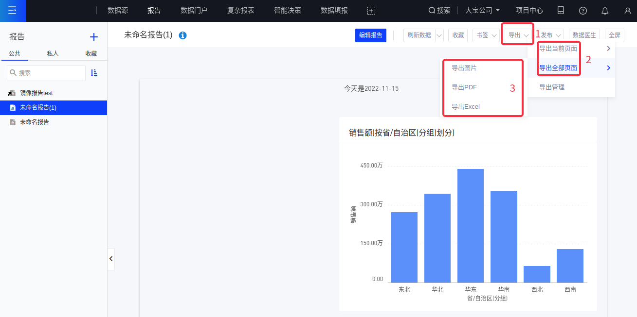在报告阅览状态,点击导出后选择导出当前页面或全部页面,会出现导出图片、导出Excel、导出PDF三个选项。