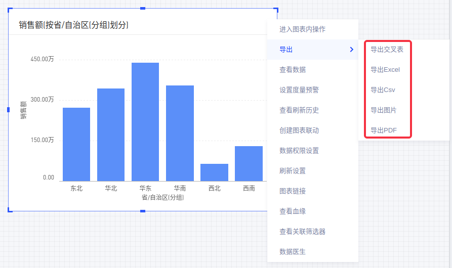 在报告编辑页面,可以对报告中的每一张图表进行导出操作,鼠标移到该图表右上方的点击更多操作操作,选择“导出”,与报告阅览状态的导出功能一致。