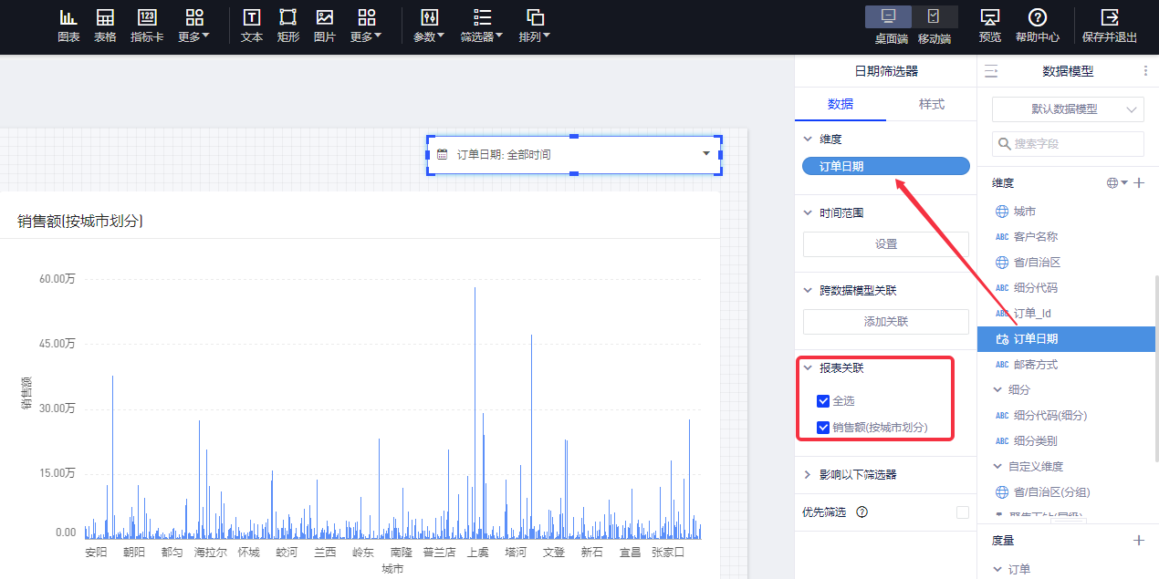 (2)在日期筛选器的数据面板的操作,将日期类型字段“订单日期”拖入维度。默认是关联当前页面的同一数据模型的所有报表;