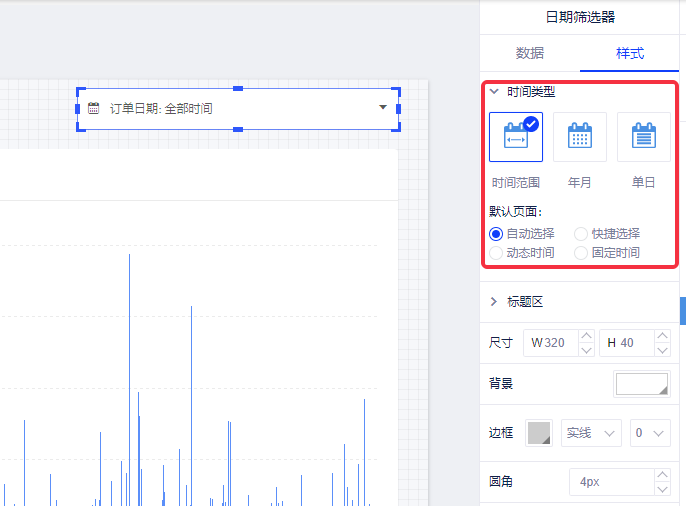 (1)选择画布上的时间筛选器,点击时间筛选器的样式面板,可以选择筛选器的时间类型:时间范围、年月或单日;