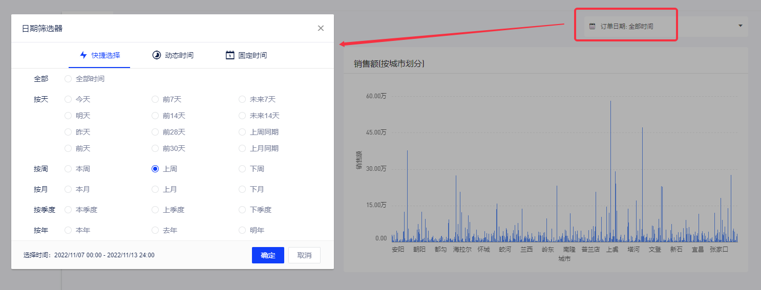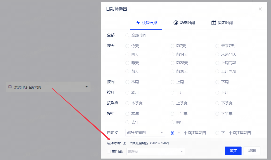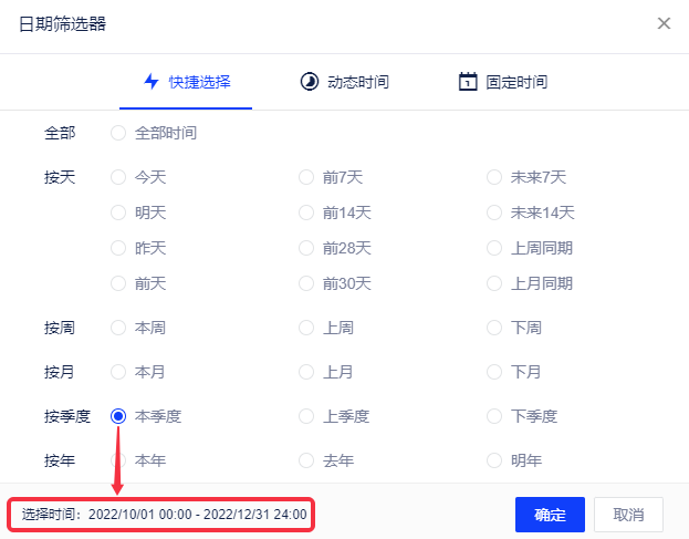快捷选择提供了全部时间、按天、按周、按月、按季度、按年共六类选项,选中某项后会在左下角显示所选的具体日期时间。