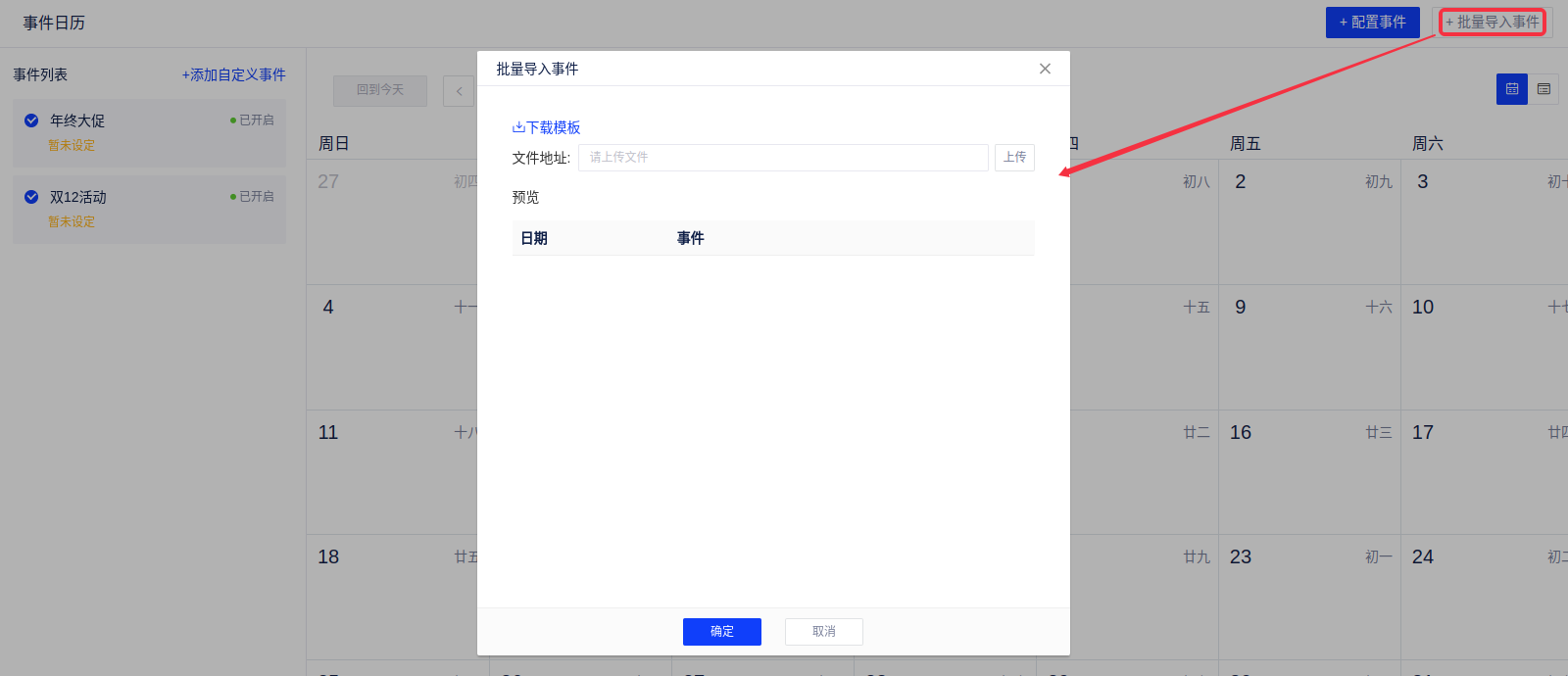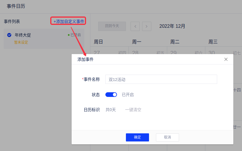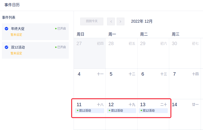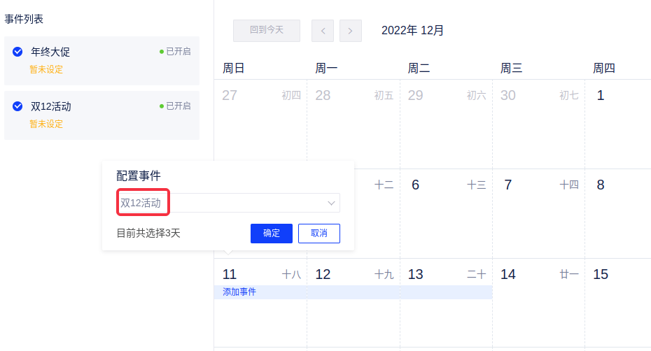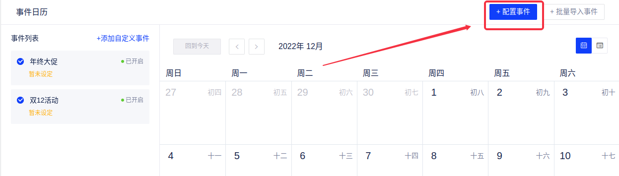 (3)点击右上角[配置事件],然后在下方日历中选择时间段并配置上一步创建的“双12活动”事件;