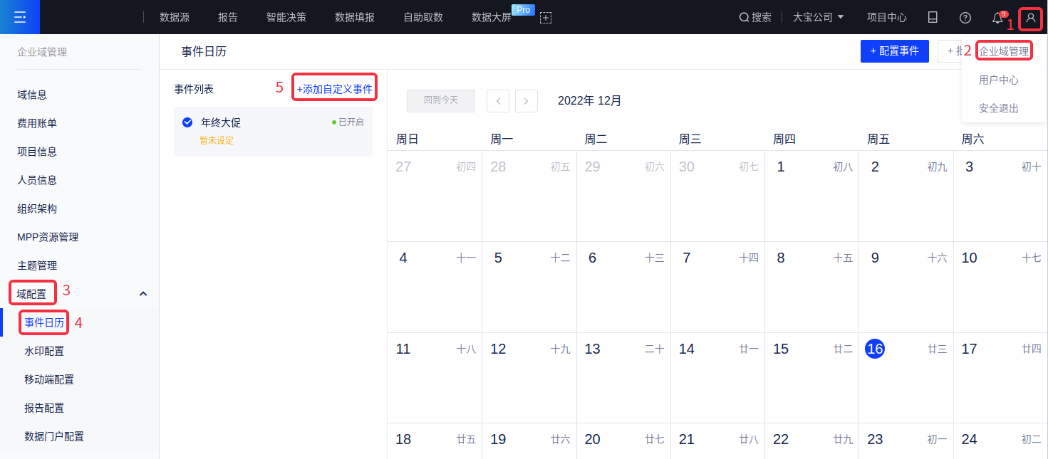 (1)点击右上角头像icon,在下拉菜单中选择[企业域管理-域配置-事件日历],然后点击[添加自定义事件];