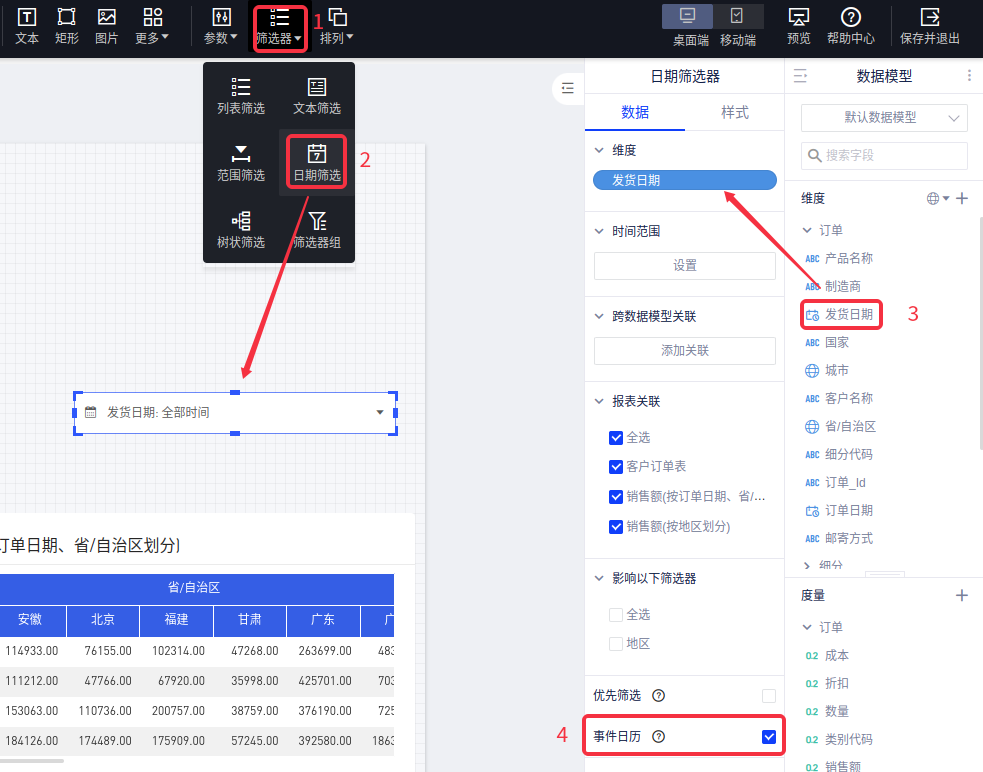 (1)回到报告编辑页面(以默认数据模型为例),在画布上添加一个日期筛选器,并将日期字段“发货日期”拖入数据面板中,然后在面板下方勾选中“事件日历”;