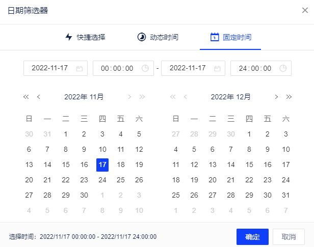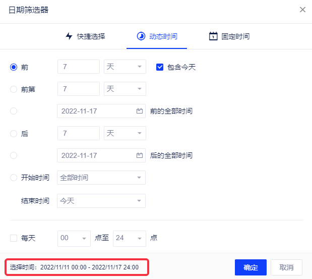 时间会动态变化。提供了4种动态时间段:前N天、前第N天、单日前/后的全部时间、后N天、自定义选择开始结束时间,选中某项后会在左下角显示所选的具体日期时间。