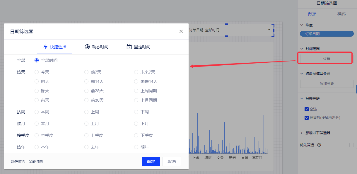(3)点击日期筛选器数据面板中的设置,弹出时间范围设置窗口,您对时间范围可进行快捷选择、动态时间段和静态时间段的设置。