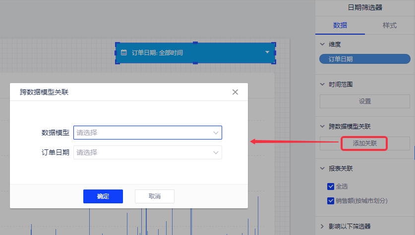 日期筛选器可以跨数据模型关联,此节内容可参考文档跨数据模型筛选。