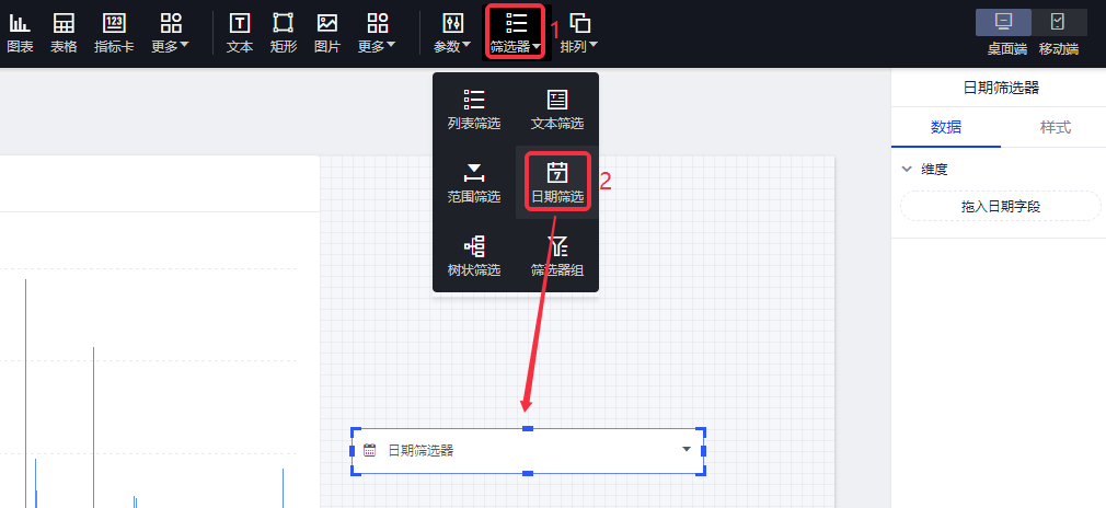 (1)在报告编辑页面,选择“日期筛选”控件,在画布上添加一个“日期筛选器”;