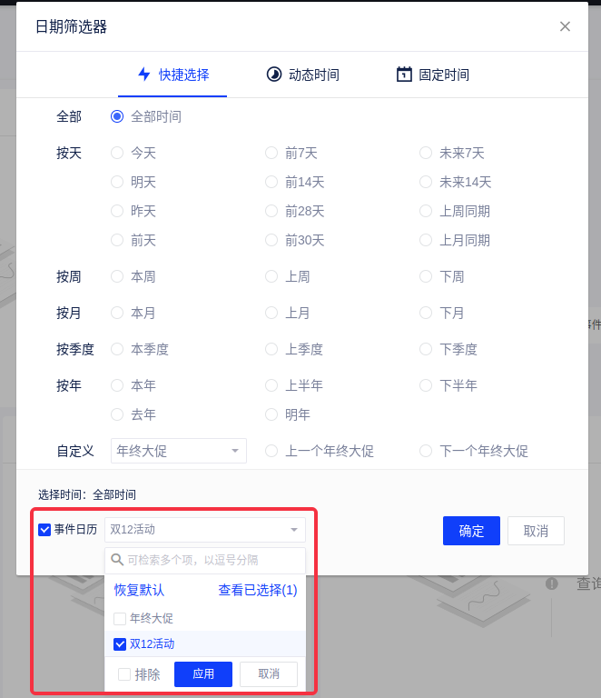 (2)在报告的预览或阅览状态,点开刚才配置的日期筛选器,可以看到多出一项“事件日历”,我们选中(或排除)“双12活动”事件,这意味着当前日期筛选范围包含(或排除)了该事件设定的时间段;