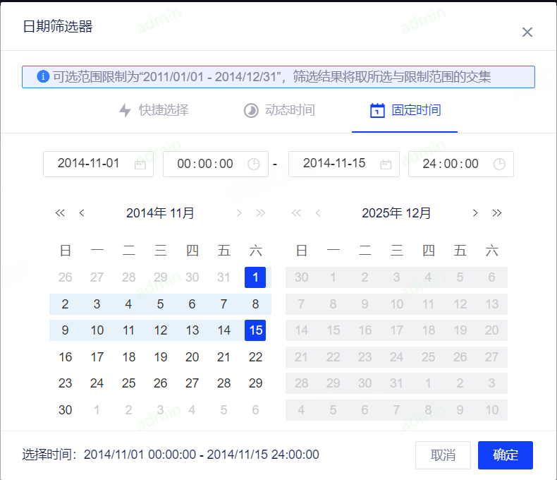 (2)开启限制范围并设置范围后,日期筛选只能在限制范围内进行选择,范围外的日期无法选中。