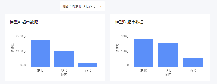 例如报告中有两个数据模型A和B,两个数据模型中都有地区这个字段,您可以使用其中一个模型的地区列表筛选器,来控制两个基于两个模型的图表。
