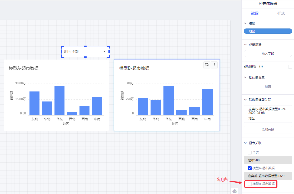 下图中有2个图表,分别来自两个不同的数据模型,现在用模型A的地区字段做列表筛选器,希望能对这2个图表一起生效。