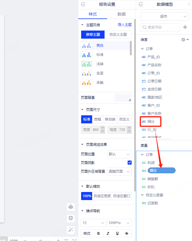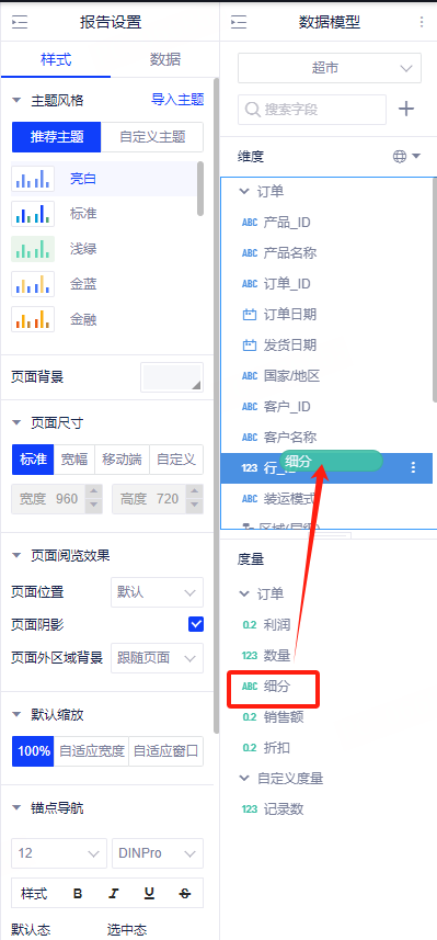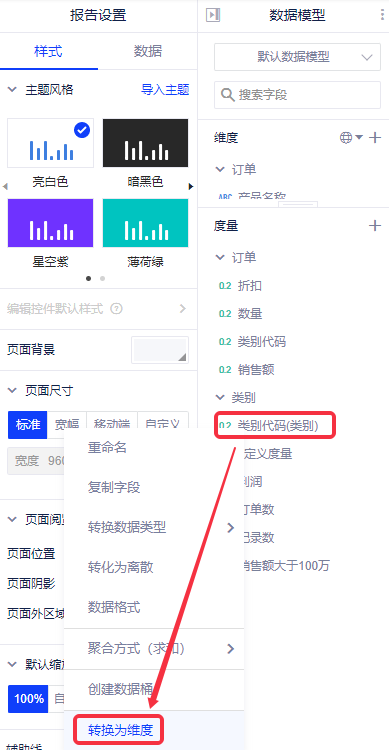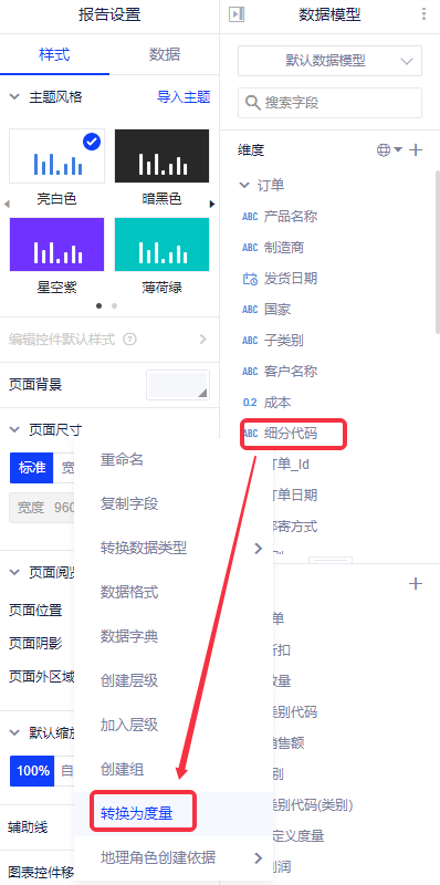 1. 概述2. 操作步骤1. 概述您可以将度量字段转换为维度,也可将维度字段转化为度量字段。 2. 操作步骤(1)维度转为度量 在维度列表中右单击需要转化的字段,在出现的弹出菜单中选择“转化为度量”或者将维度字段拖入度量列表即可。 (2)度量转为维度 在度量列表中右单击需要转化的字段,在出现的弹出菜单中选择“转化为维度”或者将度量字段拖入维度列表即可。
