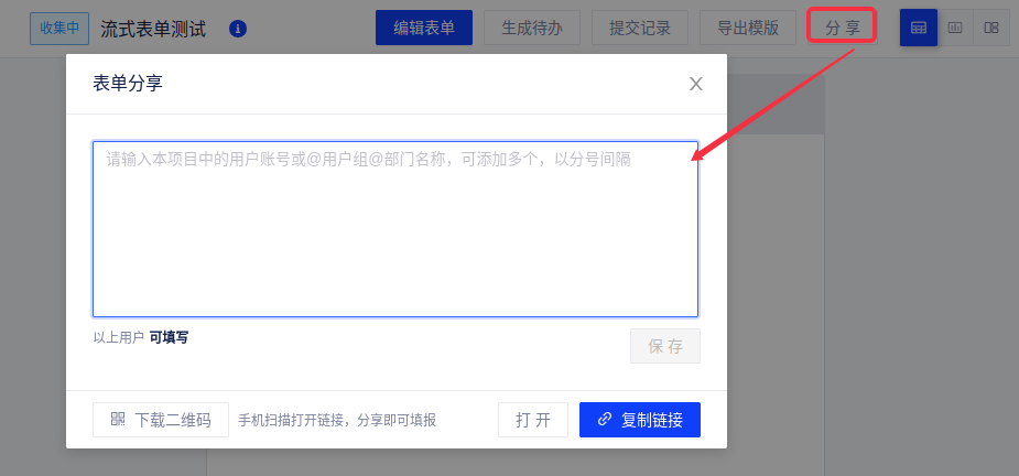 在表单列表页面,点击右上角的[分享]按钮,然后复制链接发给填写人。您还可以在这里指定本项目中的用户、用户组或部门填写(指定后其他人将无权填写),可添加多个。