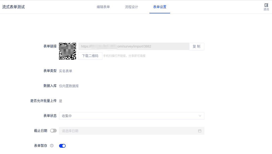 - 表单暂存:开启后,填报用户可以自由控制填报进度,不必一次性提交,可多次保存