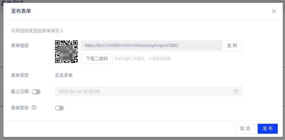(2)点击弹窗中的发布按钮,即完成发布;届时表单状态自动变为“收集中”