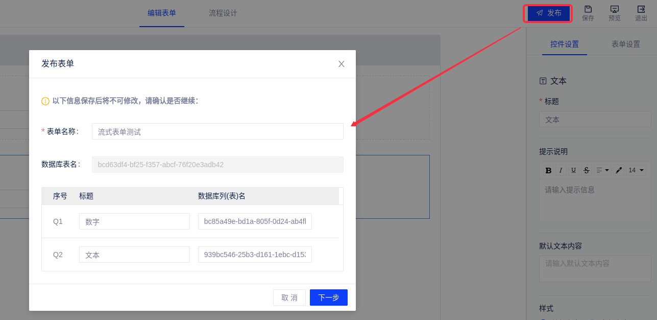 (1)选择需要发布的表单并进入其编辑页面,然后点击右上角[发布]按钮,信息确认无误后,点击[下一步]