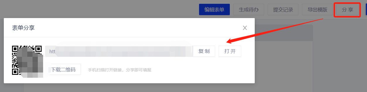 - 表单链接:将表单链接或二维码分享给成员后,成员点击链接或扫码即可填报