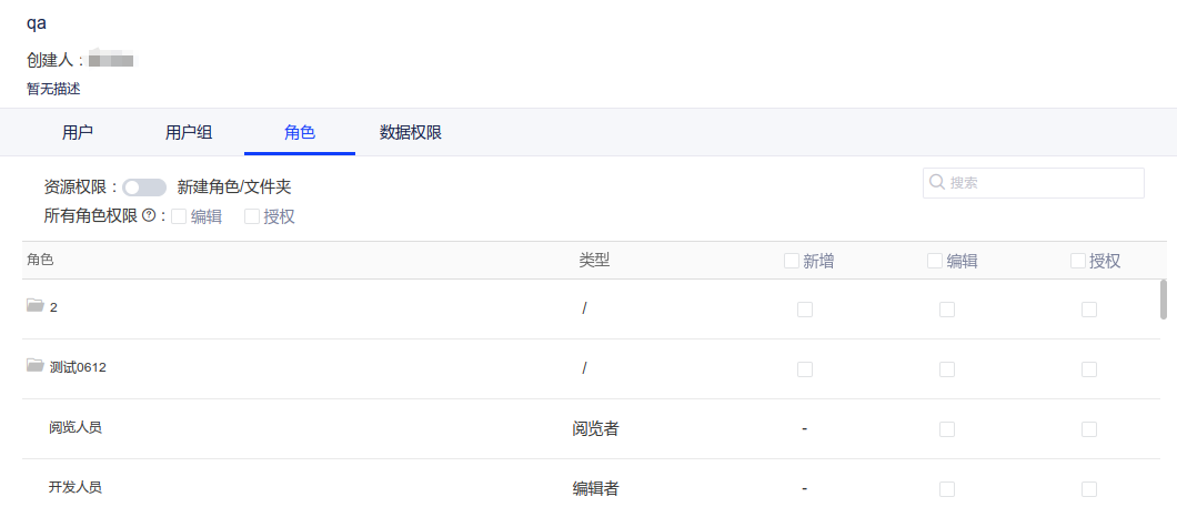 (3)管理普通(编辑、阅览)角色,可以配置该管理角色的成员在当前项目下新建角色及角色的文件夹,可以对圈选指定的角色进行编辑或授权。