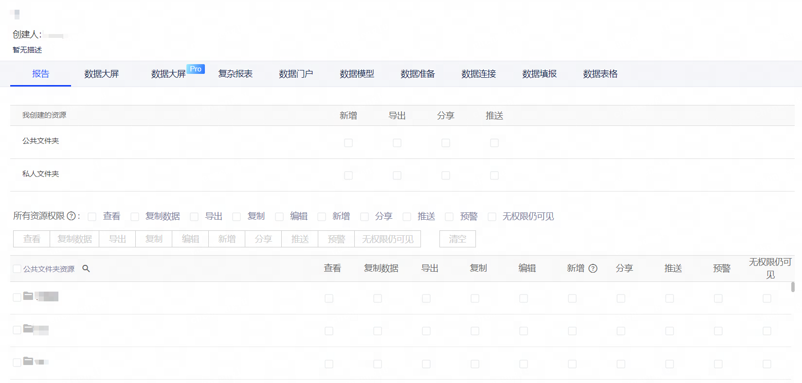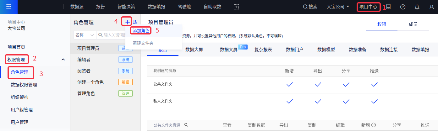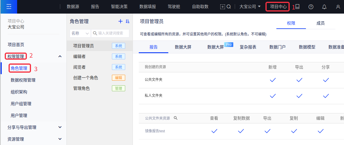 阅览者 拥有项目内所有数据连接、数据模型、报告、大屏的数据权限和阅览权限