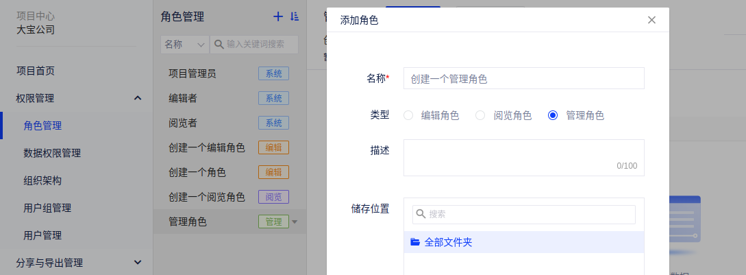 (1)在角色管理中,点击“添加角色”,与编辑角色的创建类似,点击添加角色,输入角色名称,选择角色类型为管理角色、添加描述及确认存储位置;