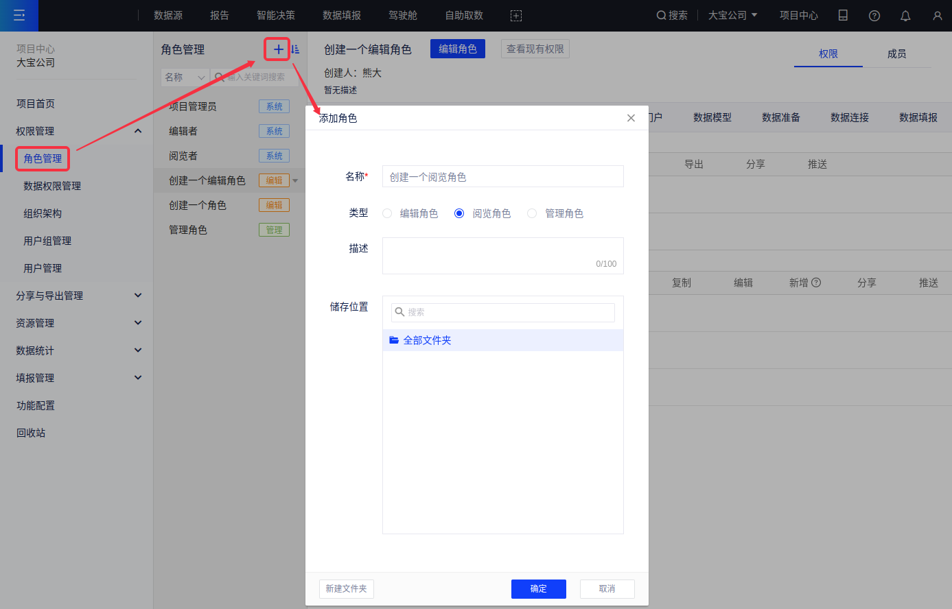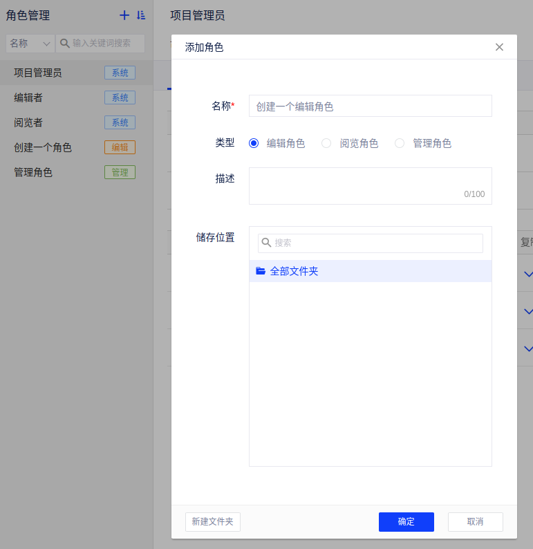 (1)与编辑角色的创建类似,点击添加角色,输入角色名称,选择角色类型为编辑角色、添加描述及确认存储位置;