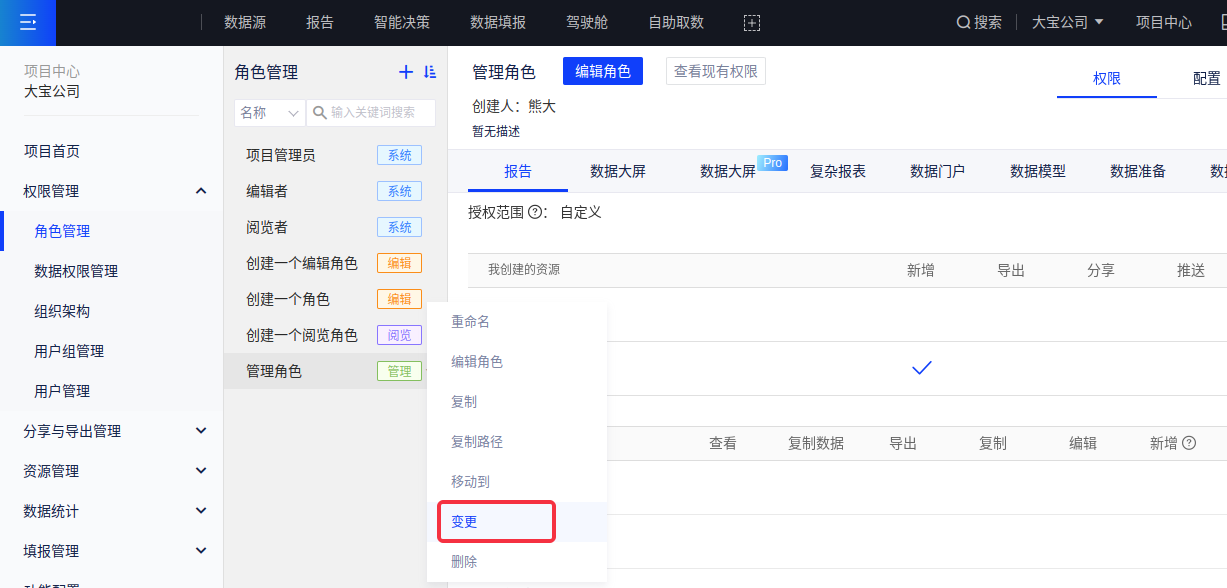 编辑者 拥有项目内所有数据连接、数据模型、报告、大屏的数据权限和编辑权限