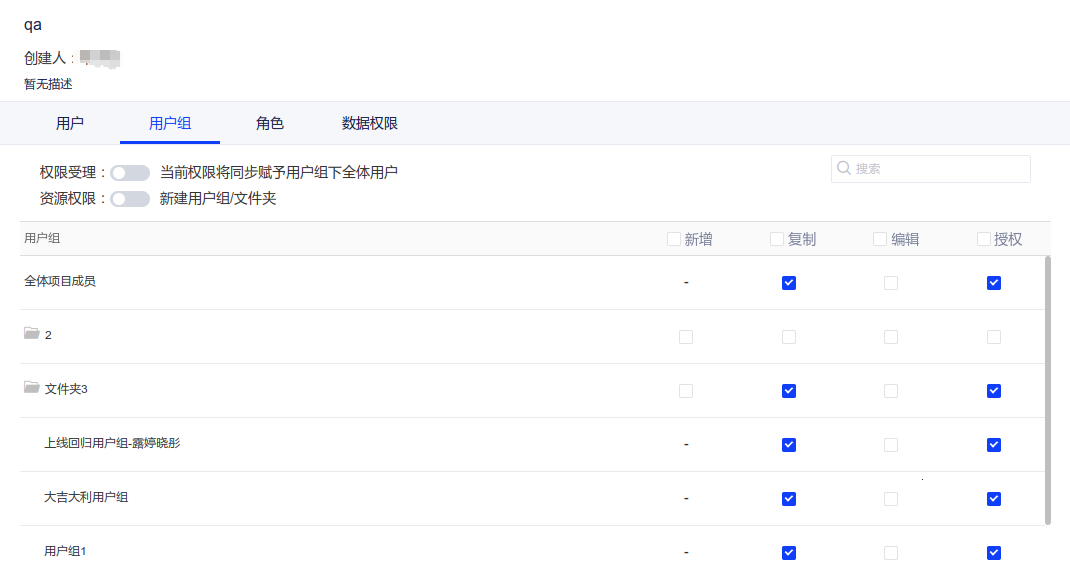 (2)管理用户组:可以配置该管理角色的成员在当前项目下新建用户组及用户组的文件夹,可以对圈选指定用户组进行编辑、查看、复制的权限赋权,但不可以单独管理某个成员;