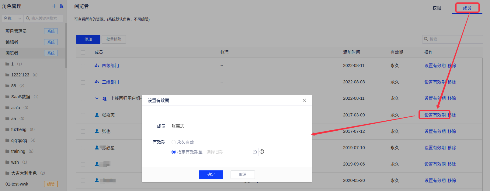 产品允许对角色下的各个成员设置有效期,在角色下添加成员后,默认有效期为永久,可重新设置有效期,指定各成员的当前角色有效期。