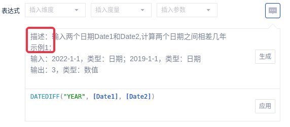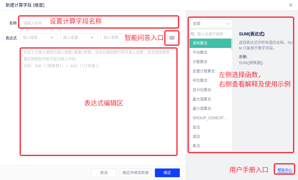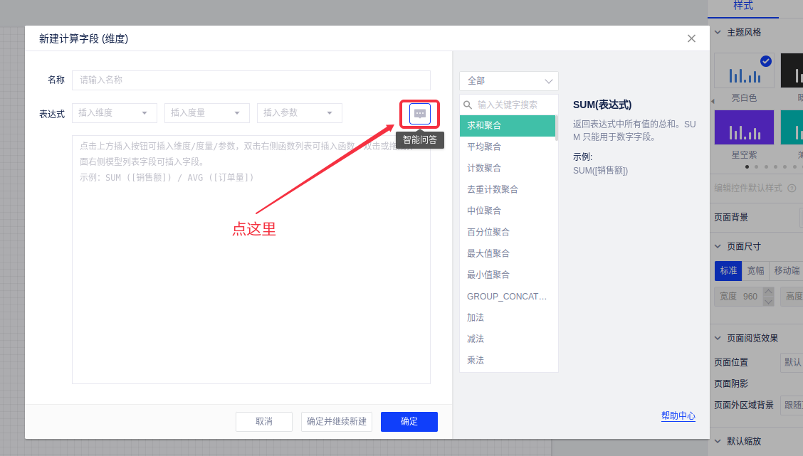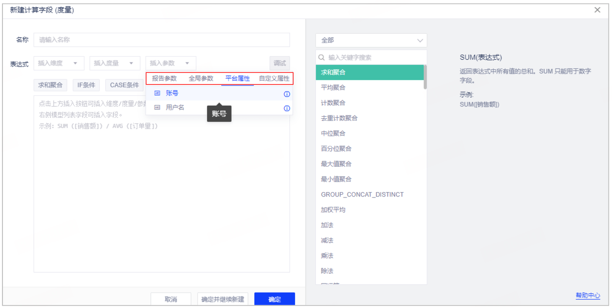 可点击右侧函数自动插入函数,同时可选择上方表达式,插入维度、度量和参数
