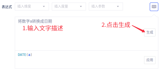 在新的弹窗中根据模板输入你的需求描述或示例后点“生成”按钮,如果您对生成的结果满意,再点击“应用”按钮,然后将不存在的字段替换为模型中的字段即可。现阶段每天最多可生成20次。