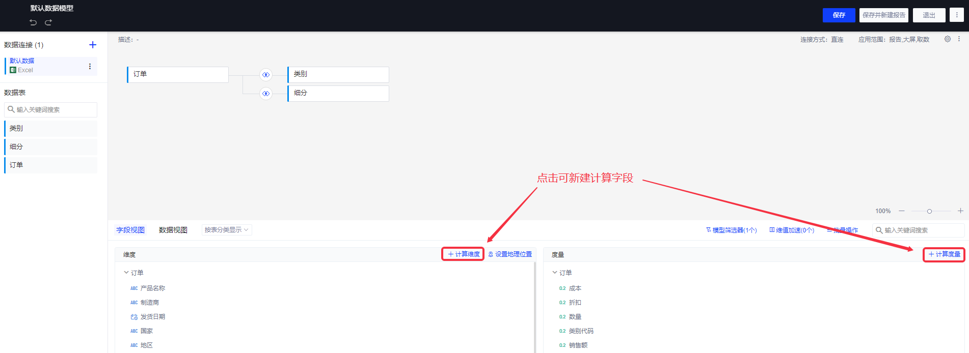 (2)数据模型编辑页面,点击新建计算维度/度量,也可新建计算字段;