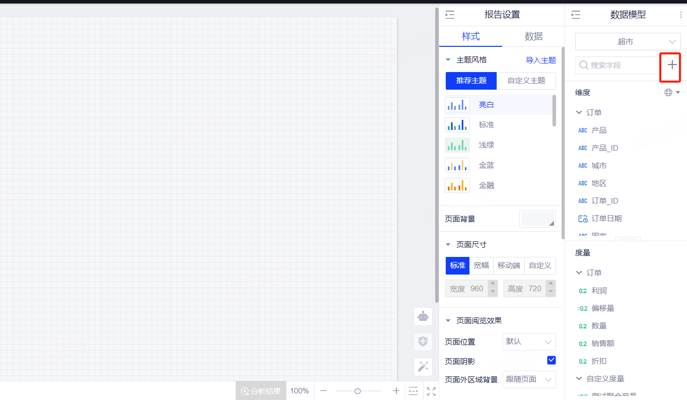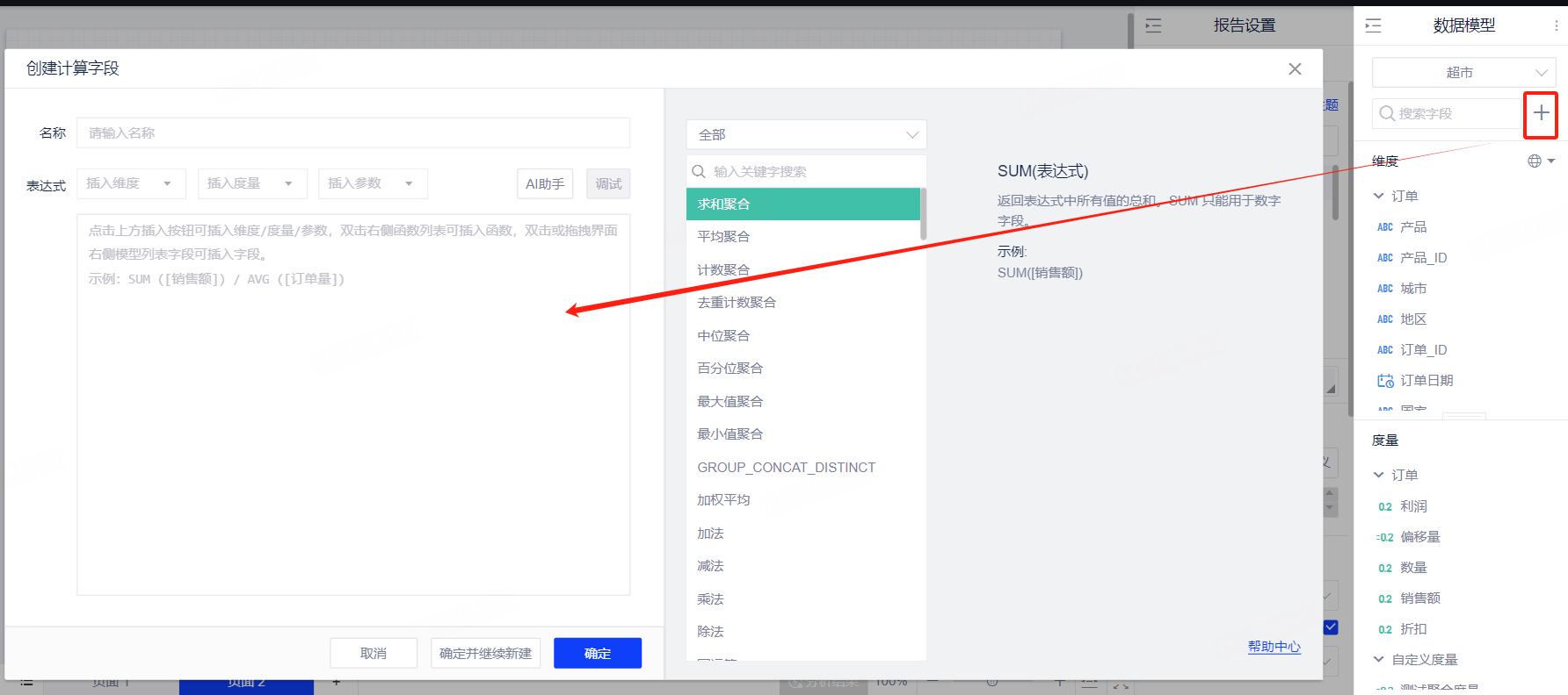 (1)报告编辑页面,点击字段列表区的右侧加号,可新建计算字段,根据计算字段的结果自动识别为维度/度量;