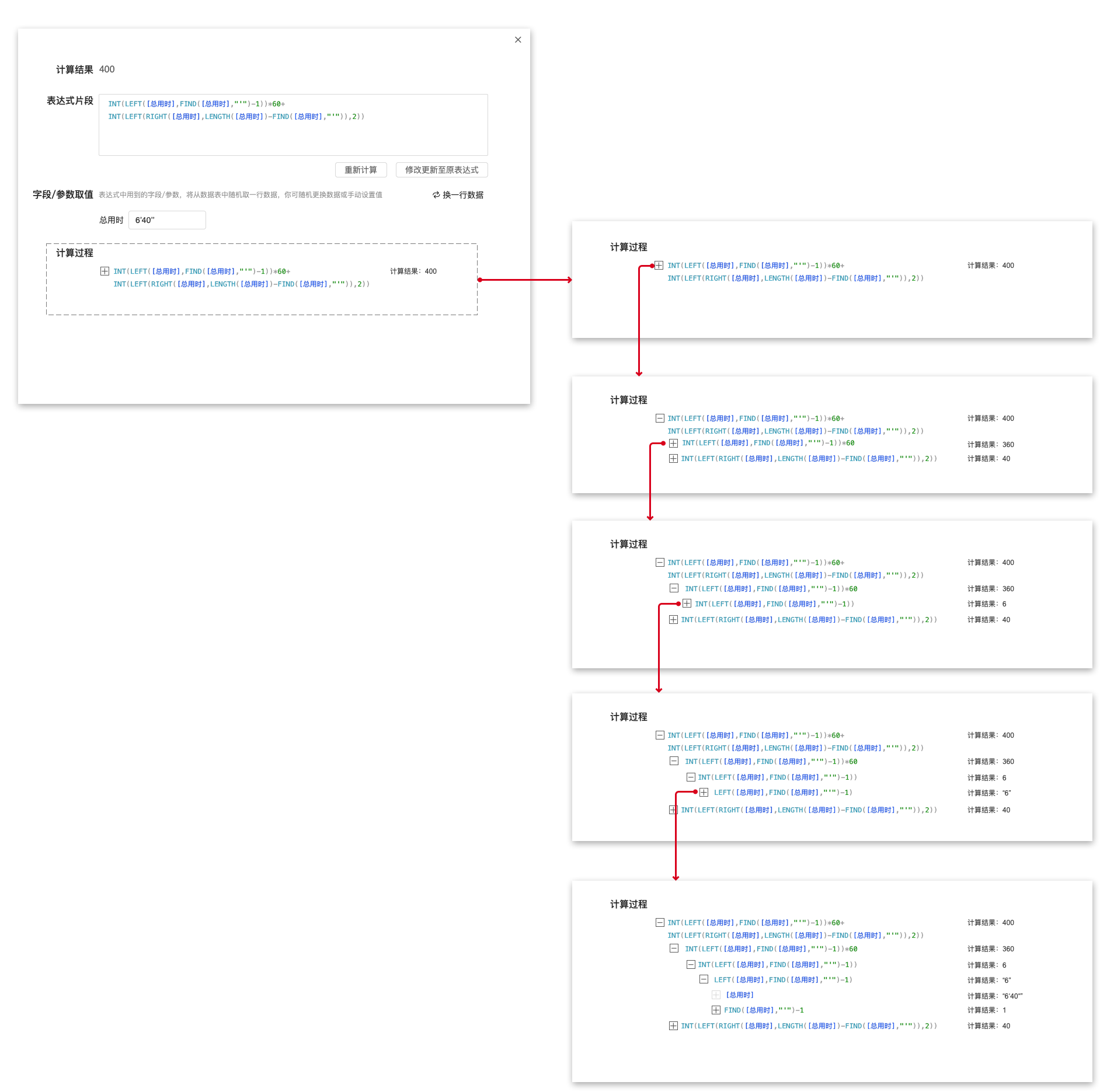 (1)在计算过程区域,支持按照表达式的计算顺序层层下钻拆分,每次钻取相当于按照计算顺序剥离了一层嵌套,把即将计算的函数的每个参数拆解为一行。如果参数还是一个函数,则支持继续对其进行钻取。