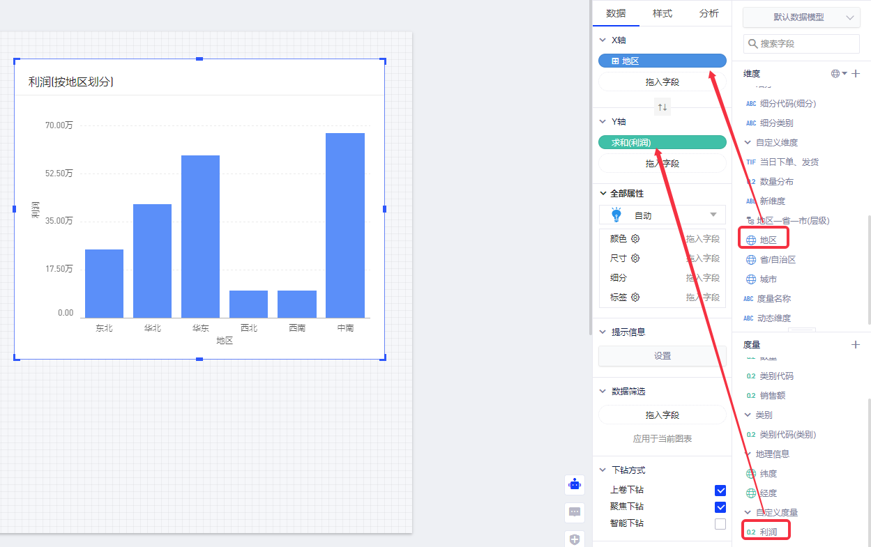 以默认数据模型为例,查看到各地区的利润情况,该模型中有“销售额”和“成本”值的字段,但并没有利润值的字段。基于这种情况,您可以使用销售额”和“成本”字段中的数据为“利润”创建一个计算字段。
