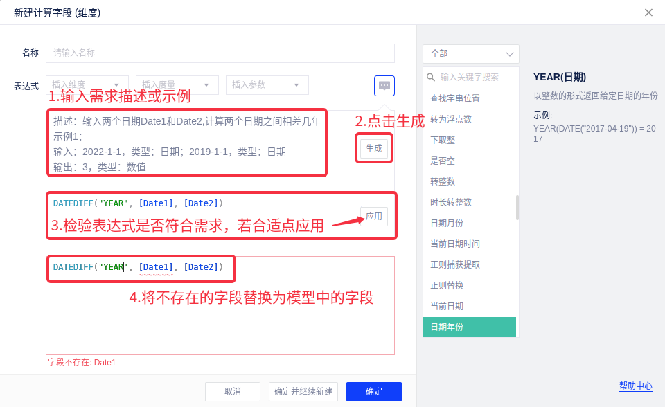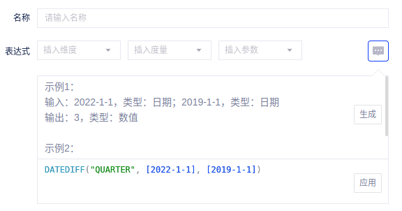 如果有这么一种功能,您只需要填写描述需求,系统就自动能根据需求生成表达式,就像聊天一样简单粗暴。基于此,我们在计算字段创建/编辑页面添加了智能问答功能。您只需提供所需的描述或示例,然后AI就可以自动为您生成计算字段的表达式。