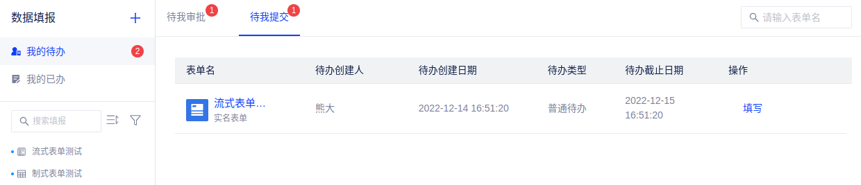 发布表单时若指定了填写人,待填写的信息将会出现在[我的待办-待我提交]里,点击“填写”可以进入填报页面。
