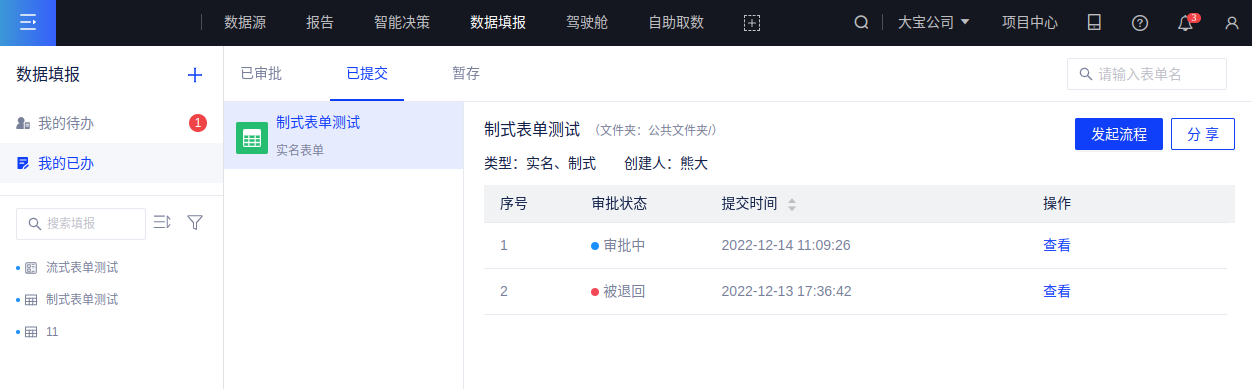 在“已提交”页面下,可以看到具体的表单数据、审批状态、提交时间、审批人。