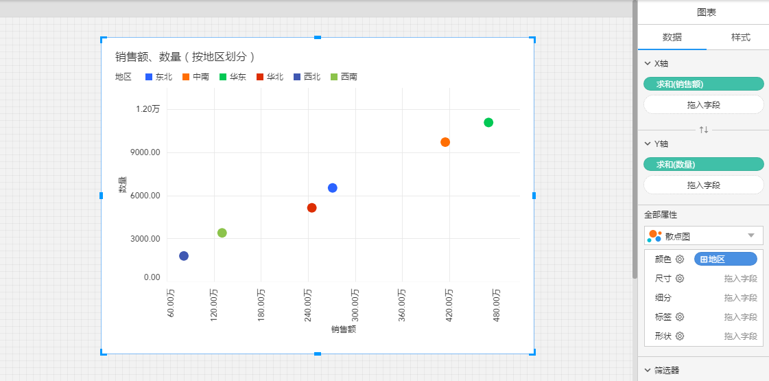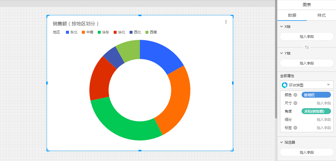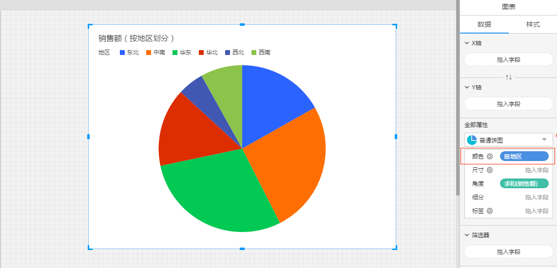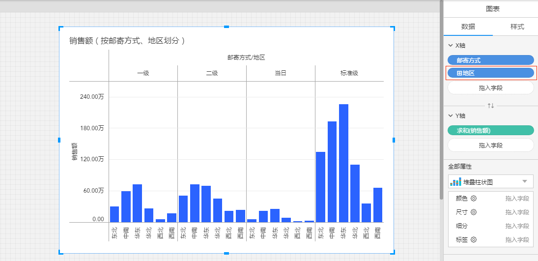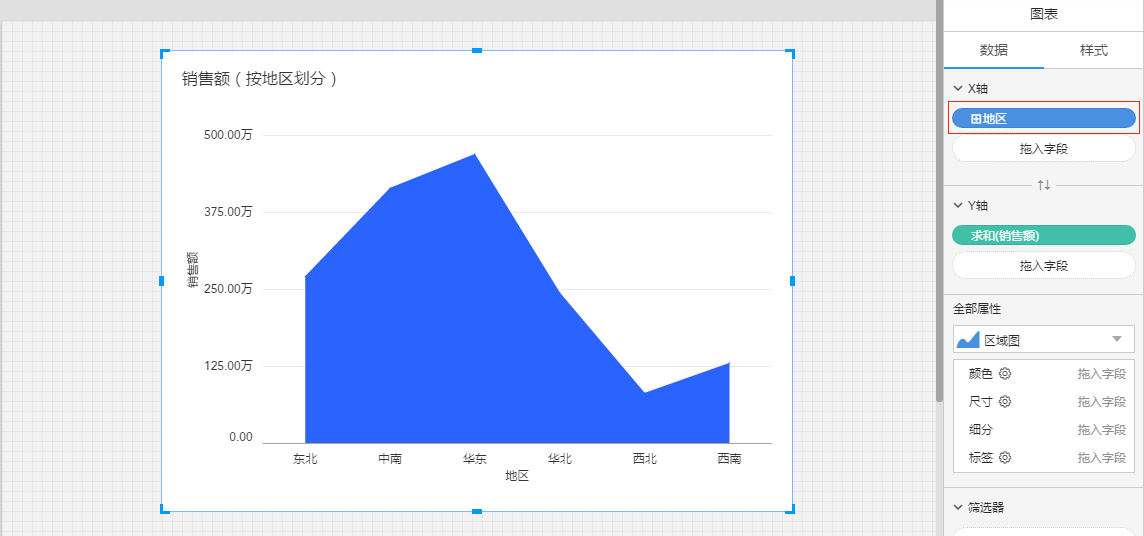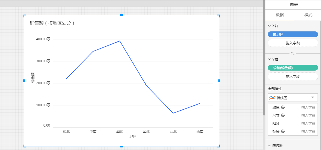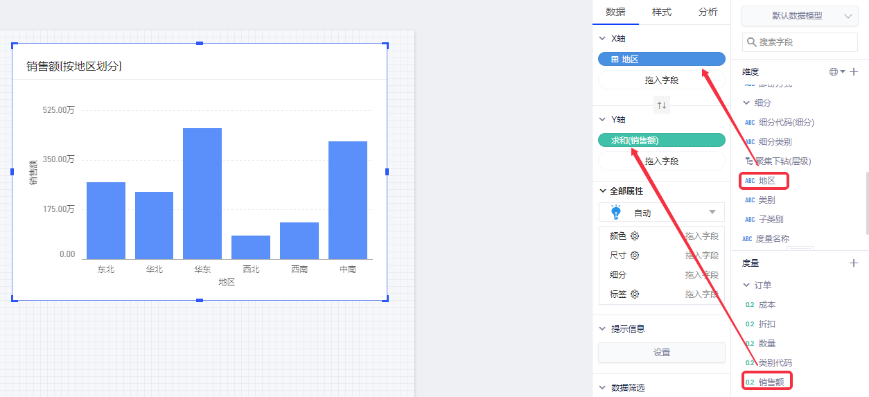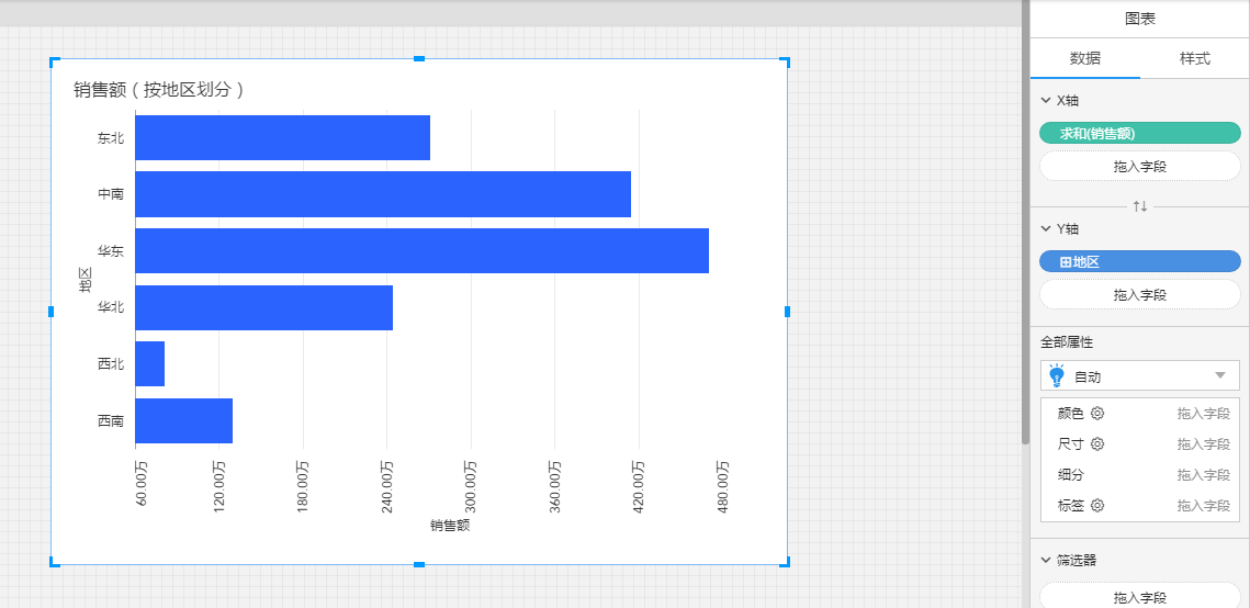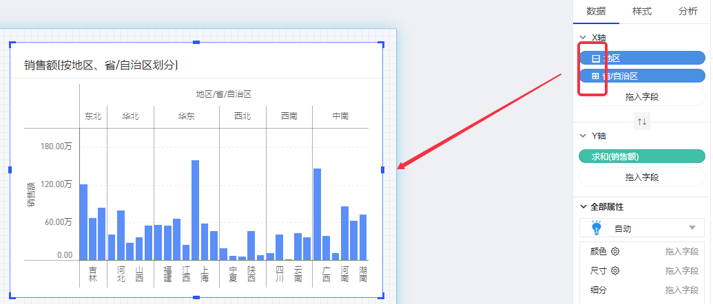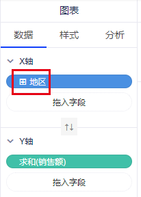 (2)创建一个新的图表,图表的X轴放入带层级的维度“地区”,Y轴放入度量“销售额”;
